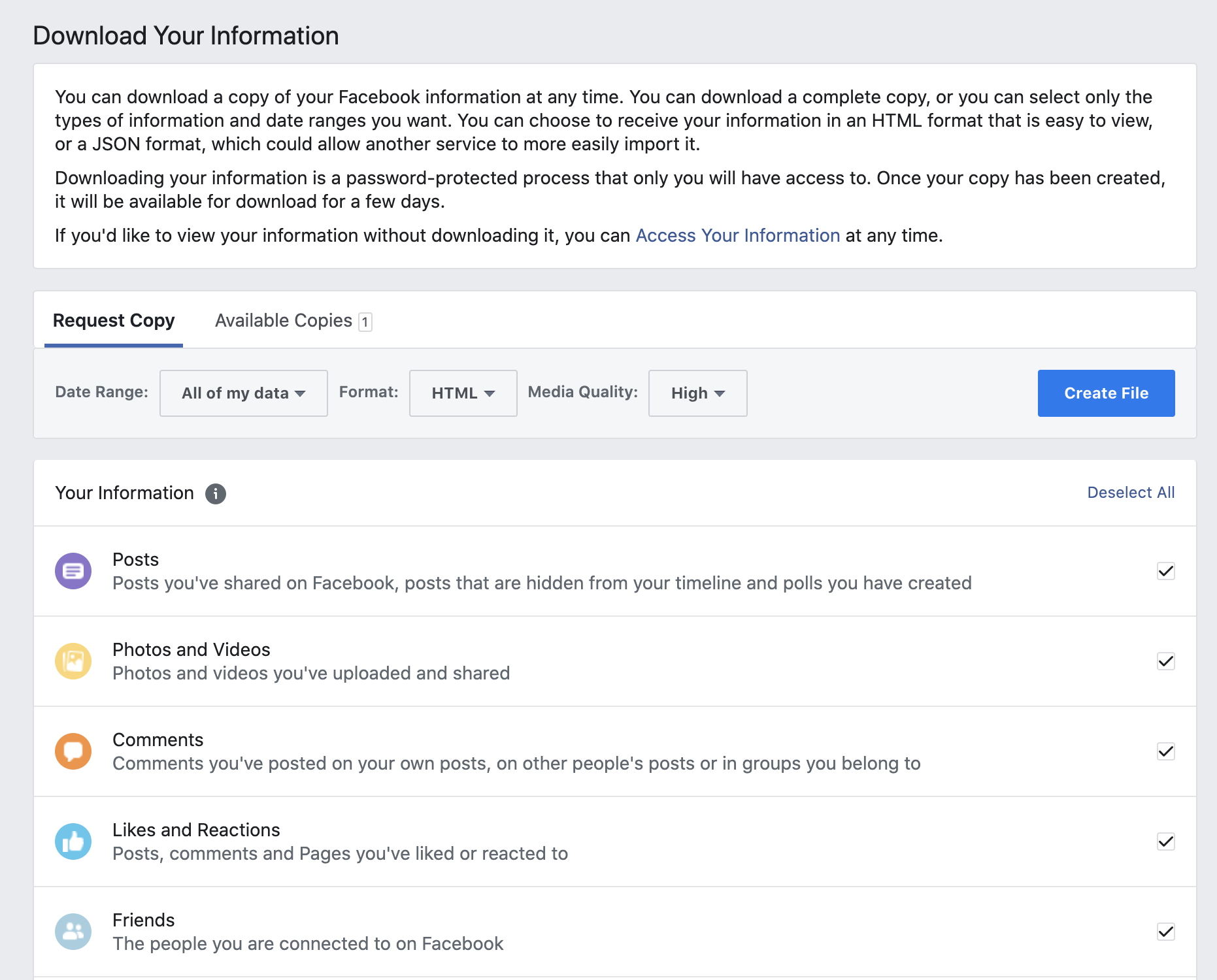 After selecting what you want, Create File. Depending on how much you post it might take a while. Once it is done, it will notify you.