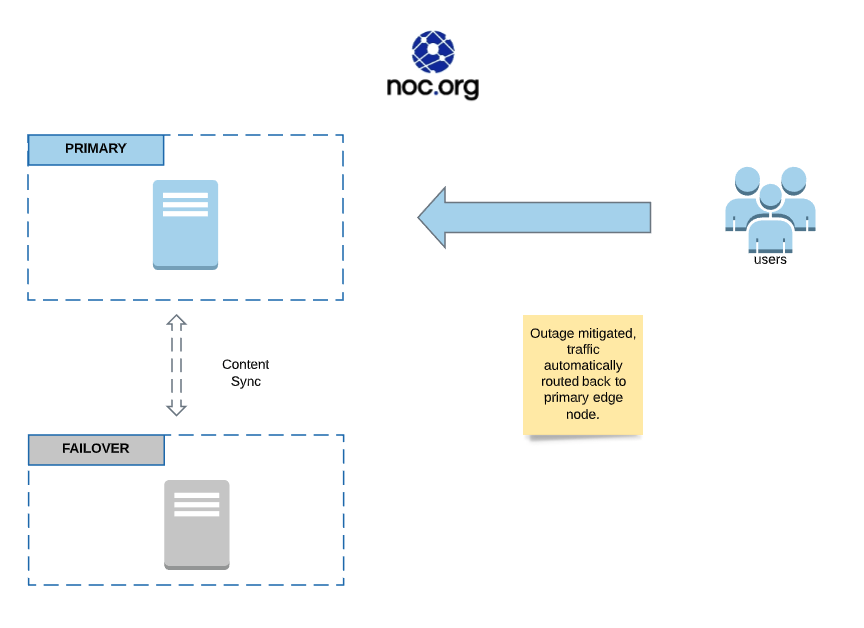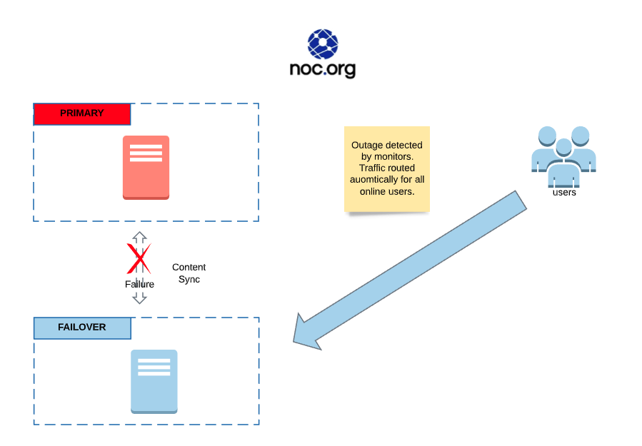 2 - NOC.org detects issue with Primary, redirects traffic to Failover within minutes: