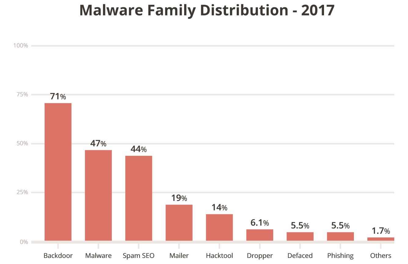Backdoors are payloads that are designed to give attackers continued access to an environment, bypassing any existing access controls. They were were found in 71% of the infected sites analyzed. You can expect backdoors to be one of the first things an attacker will deploy to ensure that even if their actions are found, they can retain access continue to use the site for nefarious actions. This is also one of the leading causes of reinfections, and one of the commonly missed payloads.