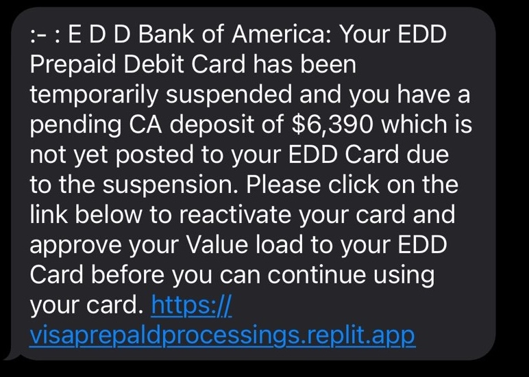 This morning I received a text message informing me that my California EDD Prepaid Debit Card was being suspended with a deposit of $6,390 until I verified my Bank of America credit card: