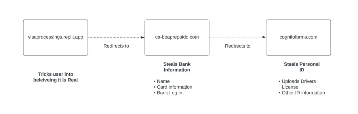 | visaprepaldprocessings.replit.app | Fake site - notice that they followed the similar nomenclature Notice that they misspelled. "paid" with an "l" instead of an "i" Notice that they are using the replit.app service to quickly spin up pages. |