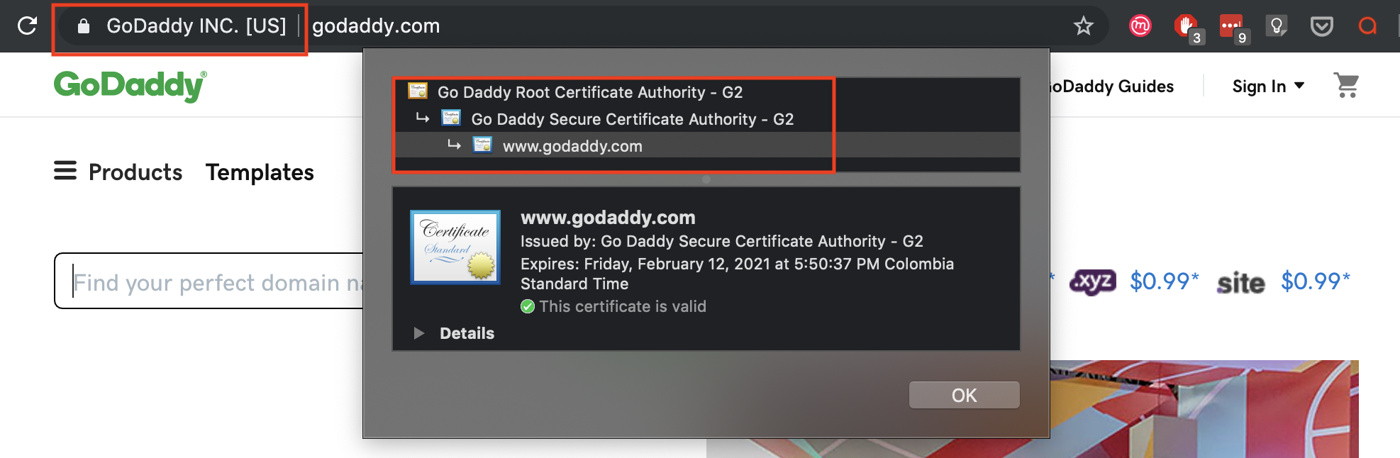 What you see in this example is that this certificate was issued to the godaddy.com domain by the GoDaddy Certificate Authority (CA). These CA's are responsible for the creation, issuance, revocation, and management of SSL certificates.