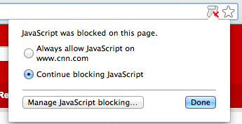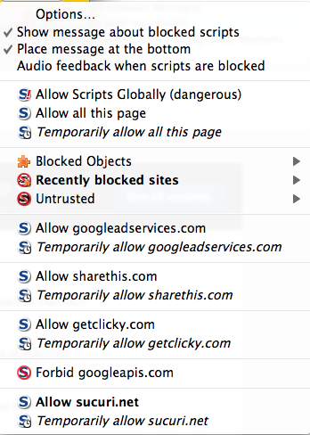 options You'll be greeted with a dialog that shows you all the various JS objects trying to run. You'll have to option to allow the entire domain, or allow specific JS objects. If you're anal and paranoid, you'll like this option: